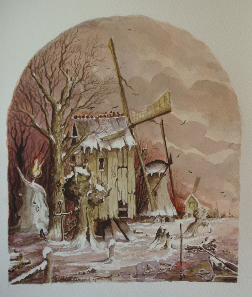 Romantiek Papier Aquarel Realisme Fantasie Boot Anker Molen Kaars Avondrood Kerst