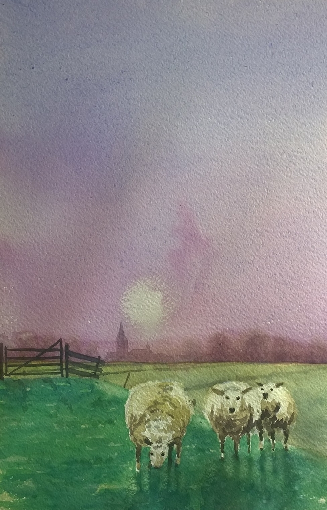 Dieren Aquarel Dijk Schaap Schapen Avond Tegenlicht