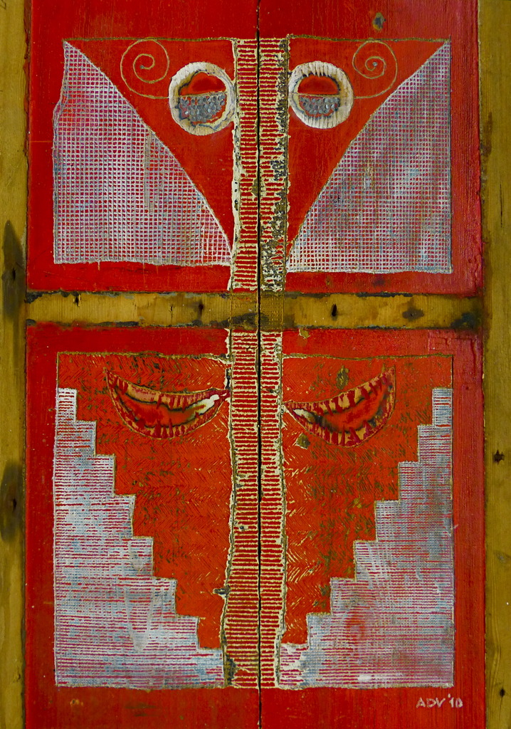 Twee samengevoegde kastplanken in oorspronkelijk rood. Onderlagen: zwart en wit plamuur. Bewerking: kraswerk met els. Spijkertjes in cirkels geslagen. Kleur wit toegevoegd.
