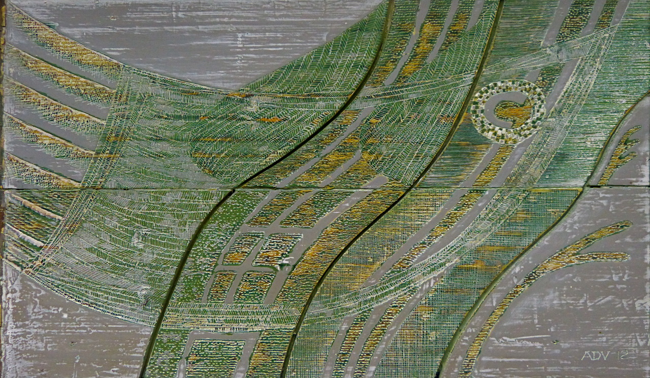 Grijs paneel in 4 stukken gezaagd en iets uitelkaar geschoven. Landschap. Onder grijze laag groen. Wit opgebracht. Bewerking met els, schuurschijf, schuurpapier.