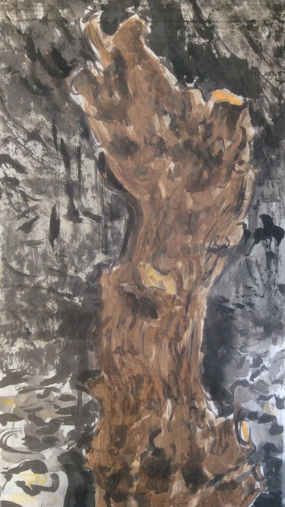 Gedeelte van de stam van een Els, geschilderd met inkt, bister en inkt gemaakt van de bolsters van walnoten