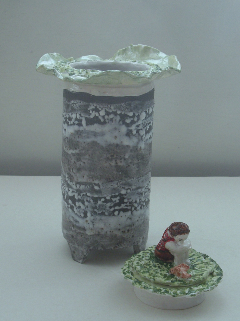 zwart steengoed gecombineerd met porselein. Een vaas met een doosje dat in de vaas past. Op het deksel twee figuurtjes (meisje en vogel) in het groen