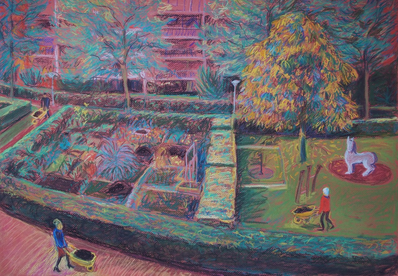 met kruiwagens brengen de tuiniers een lading kompost voor hun moestuinen