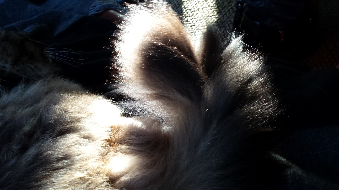 Spel van het licht, de schaduw en de haren in beeld gebracht. De staart is van mijn Noorse boskat.