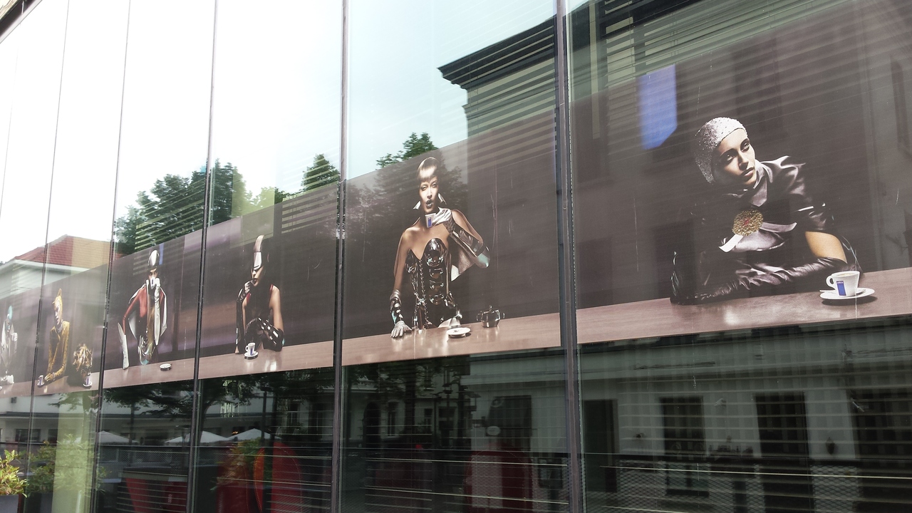 In de spiegeling op de muur zijn de afbeeldingen te zien van de figuren en de stad. Antwerpen 2015
