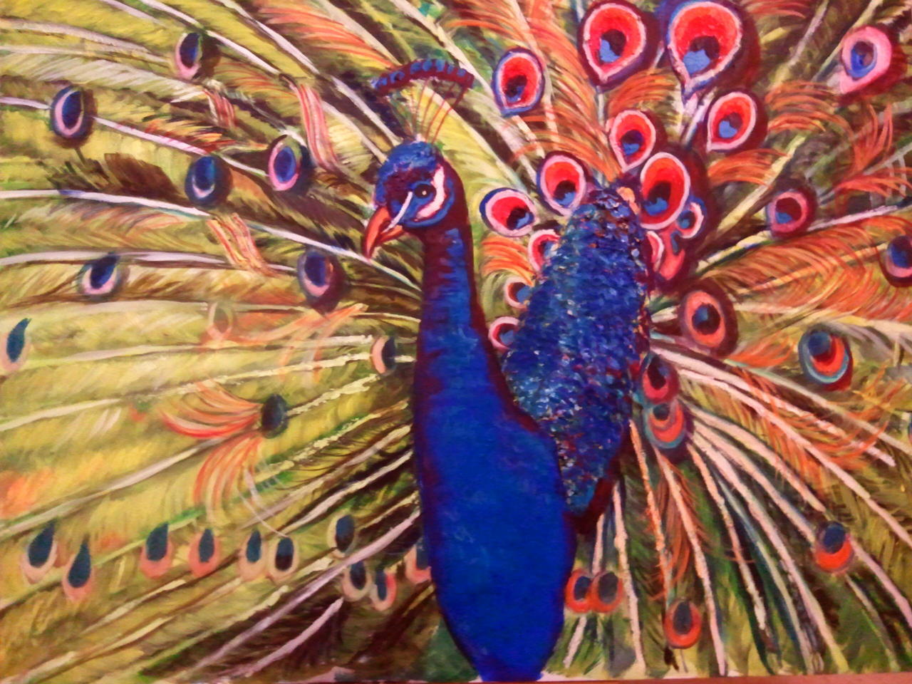 ik liep langs een dierenpark toen er een pauw naar mij toe kwam en trots zijn veren showde. ik heb hierin mijn eigen gevoel gelegd.