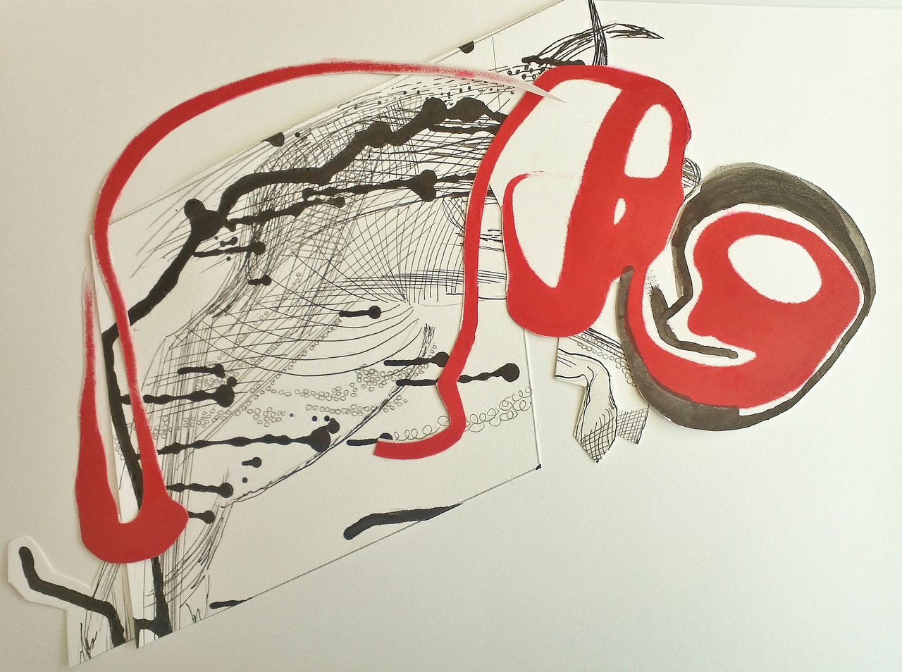 Collage; verschillende lagen op elkaar, pentekening en rode inkt. Stier, mannelijke energie. Niet te koop.