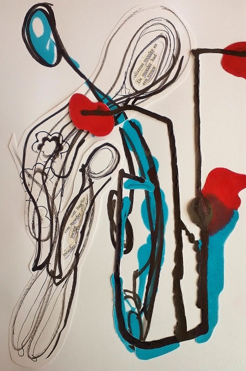 Collage van verschillende ecoline lijnen en figuren en boekbladzijden, blauwe en rode inkt.
