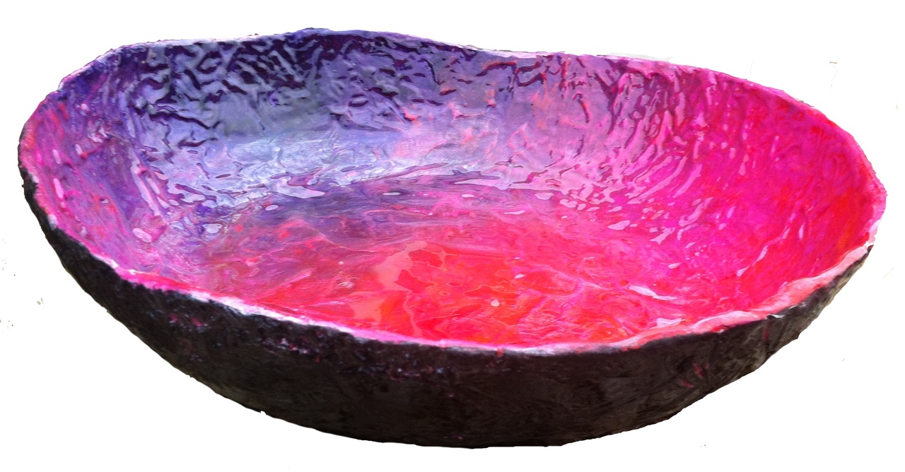 Schaal Materiaal: Kunsthars Kleuren: Overloop van Rood, roze, paars met paarlemoer. De onderkant van de schaal is donker grijs met accenten. Afmeting: Doorsnede 35 cm Diepte 8 cm