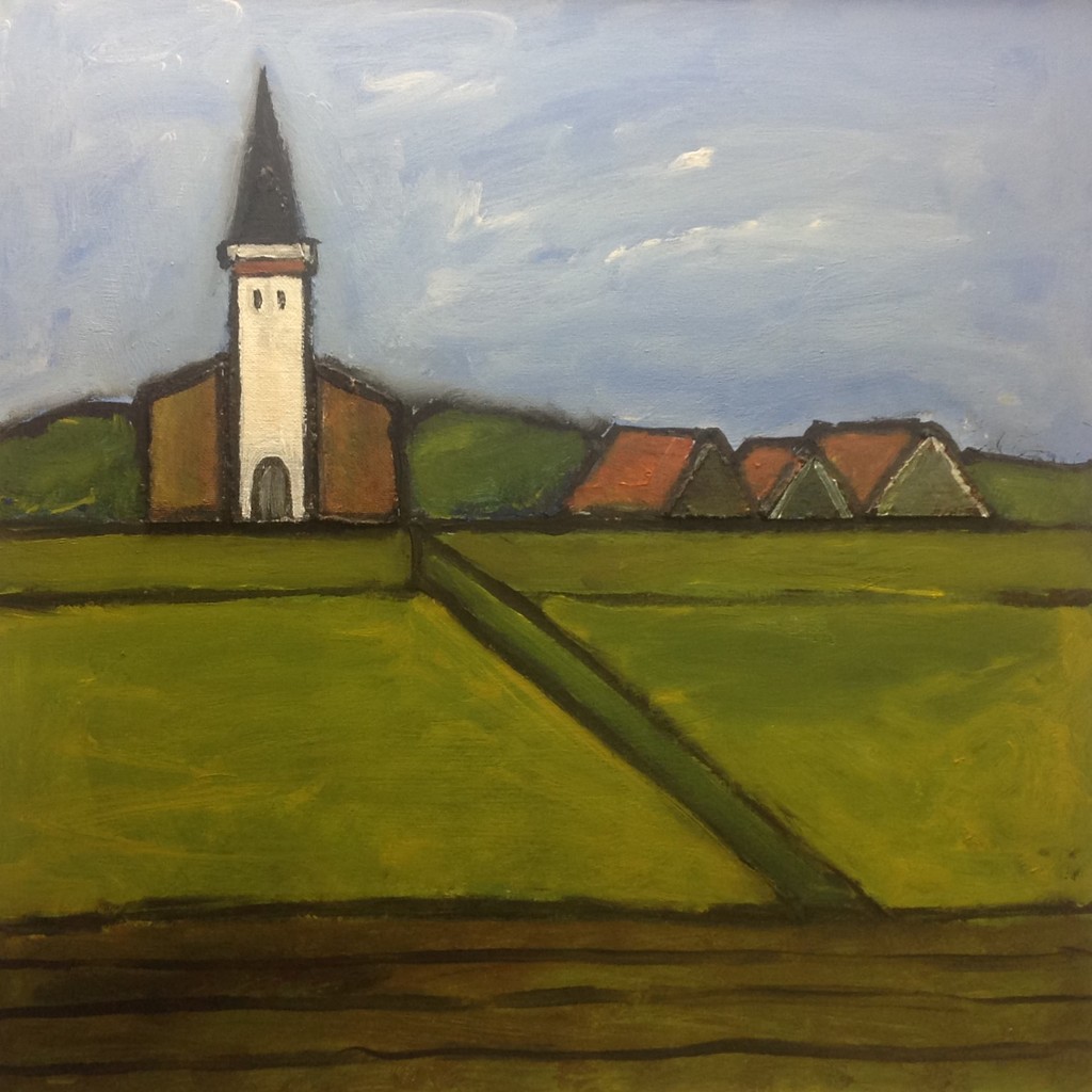 Collage waarbij met verschillende technieken (verf en collage) de Texelse eenvoud wordt verbeeld. 67 x 67 cm (incl. 5 cm brede witte kozijnlijst). VERKOCHT.