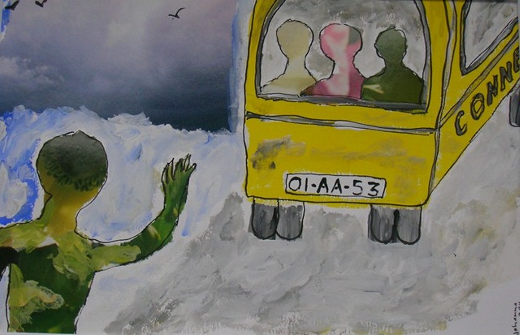 Geel Landschap Abstraherend Collage Schoolkinderen Bus