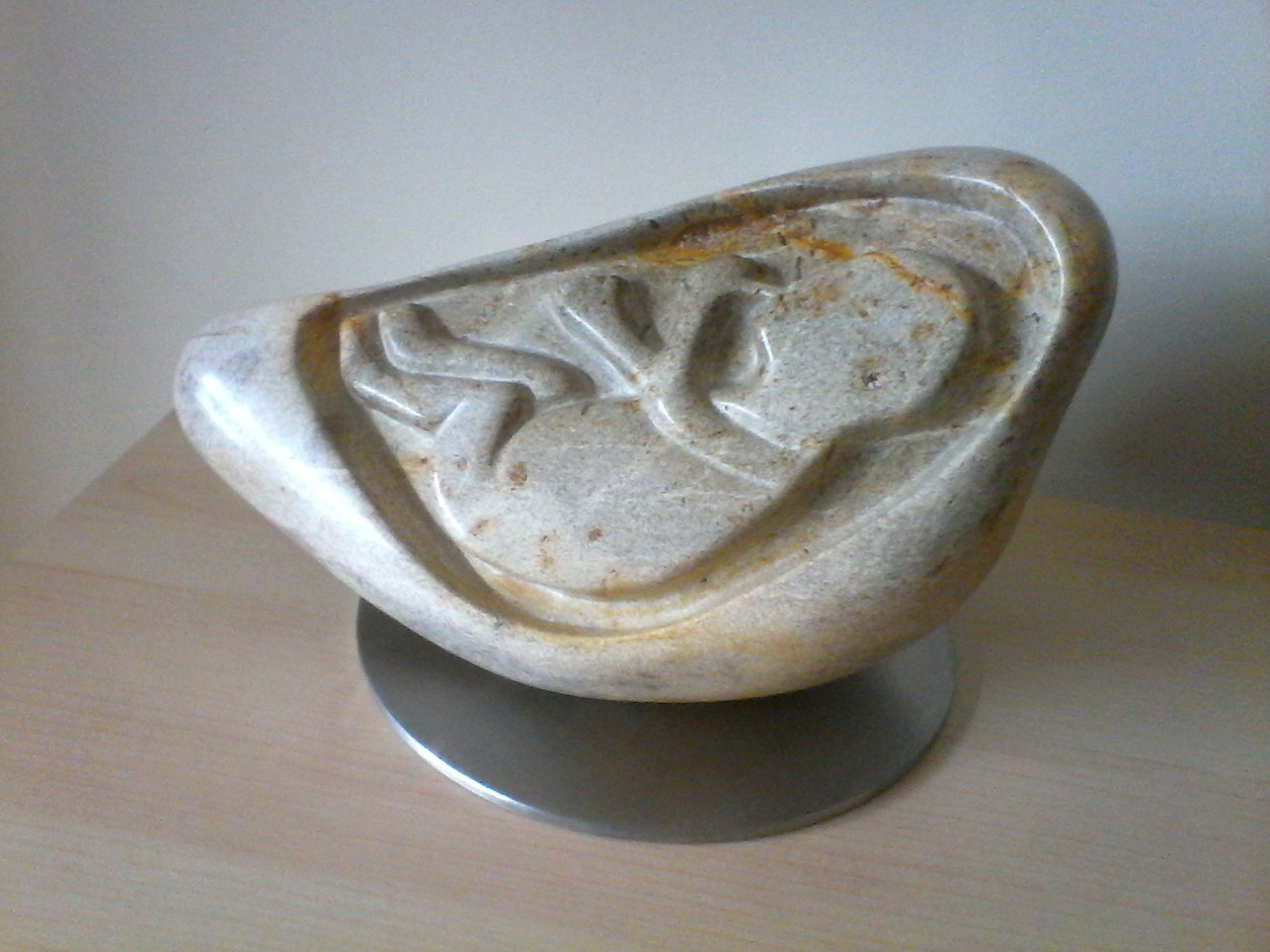 Embryo uit braziliaans speksteen op RVS sokkel