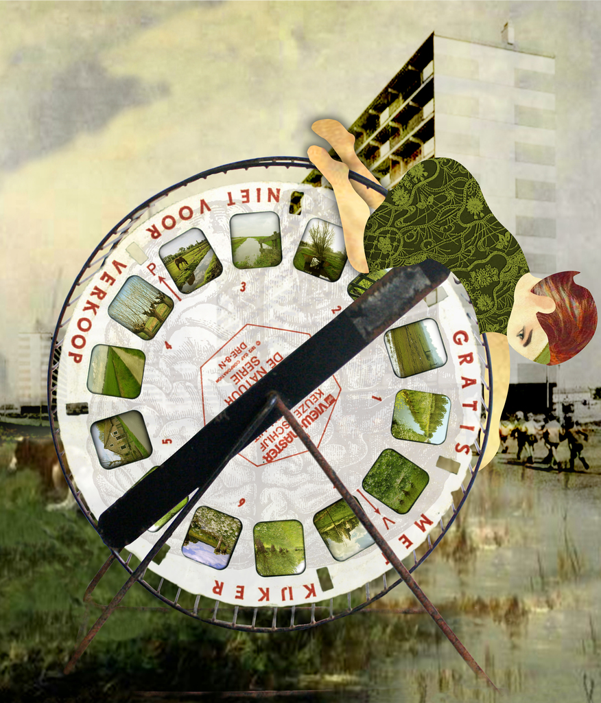 Geduld op papier 12: Wie kan er nou een lage zon die door de mist heen het bos uitlicht, een paddenstoel in het warme herfstlicht of het ontluikende groen van het voorjaar weerstaan? Maar na een flinke klim uitkijkend over de bergen vind ik dat wel mooi maar ben vooral blij dat ik niet verder omhoog hoef te klauteren. Wanneer ik vanuit het oosten voorbij Utrecht rij en die coulissen uit het landschap verdwijnen en de lucht weer ruimte krijgt kom ik thuis. In die wereld met de lage horizon en heb ik het gevoel dat ik weer kan ademhalen. In mijn landschap is het waterpeil zo hoog dat er geen prikkeldraad afrasteringen rond weilanden nodig zijn en is er heel veel lucht, lucht die altijd in beweging is en waarin je bijna kunt verdwijnen. Mijn lagere school, de Notenkraker, stond aan het Bachplein in Schiedam en wij gingen wonen in het tweede huis dat werd opgeleverd van de nieuwbouwwijk “Woudhoek”. Mijn moeder klaagde over het vieze water en de stank van Botlek. Ik herinner me de knotwilgen, het fluitenkruid en de polder die ik zich voor ons huis uitspreidde. Toen ik een werk ging maken voor Landschap in mijn Hoofd werd dat landschap uit mijn kindertijd de inspiratiebron. In mijn collage heb ik gebruik gemaakt van het schilderij: Koeien in de polder van Cornelus Westerbeek en een foto van J.F.H. Roovers van het Bachplein uit 1969. Samen vormen ze het decor van de herinneringen in mijn hoofd. Dit is mijn bjdrage aan de expositie 'Landschap in mijn Hoofd' van St. Beeldruimte.