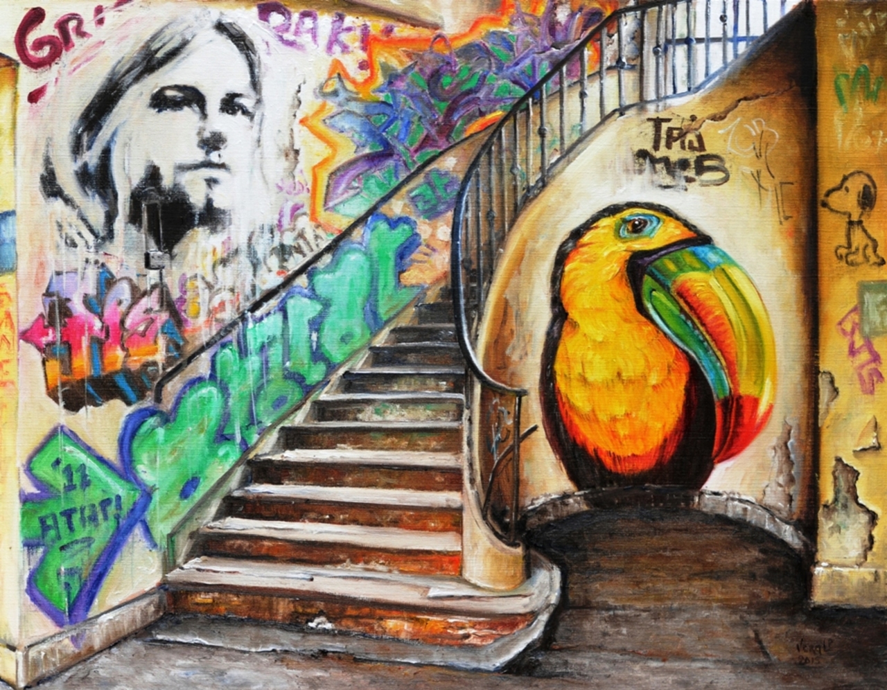 Muurschilderingen en graffiti verfraaien een vervallen traphal. Dit werk is gemaakt met de beste olieverf op Handvervaardigd Vlaams linnen