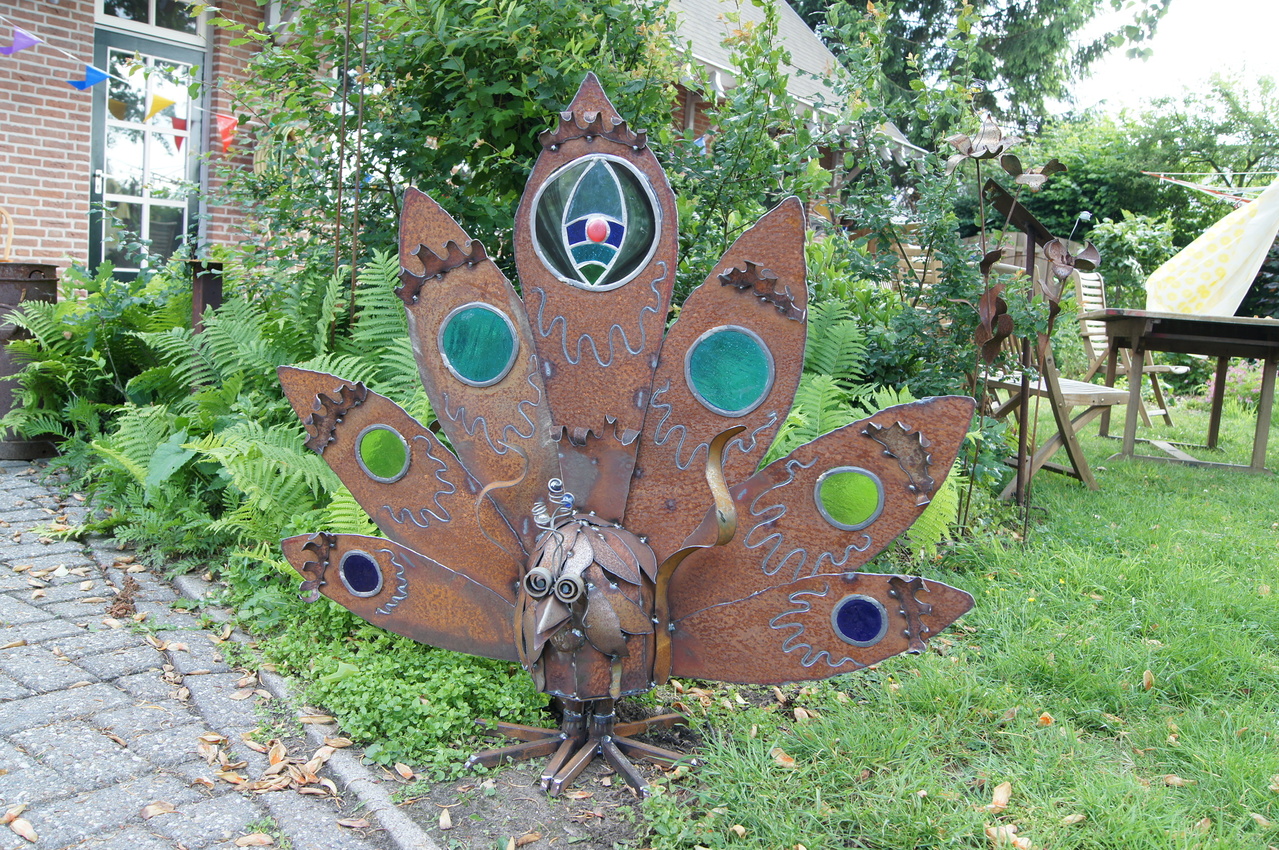 pauw van metaal met glas in lood