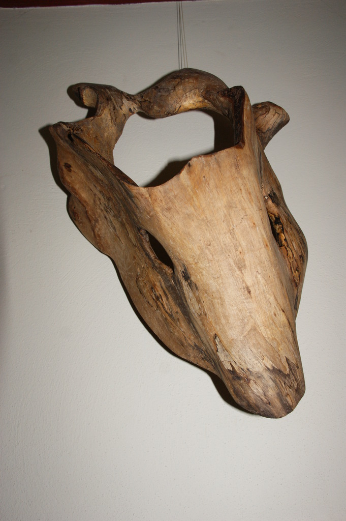 Tilia eurpaea, linde sterk verrotte takaanzet dun gemaakt tot een beeltenis van de bottenstructuur van de kop van een zwijn.