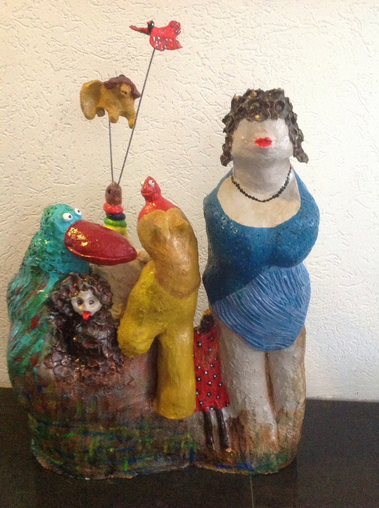 Surreeel beeld met verschillende voor en achterkant. In totaal 11 verschillende figuren in compositie. Achterkant is op andere foto te zien. Plural 1 en plural 2 zijn dus 1 beeld. Afgewerkt met acryl. Door de kwetsbaarheid van het werk is het alleen op te halen uit Drenthe of in overleg te brengen