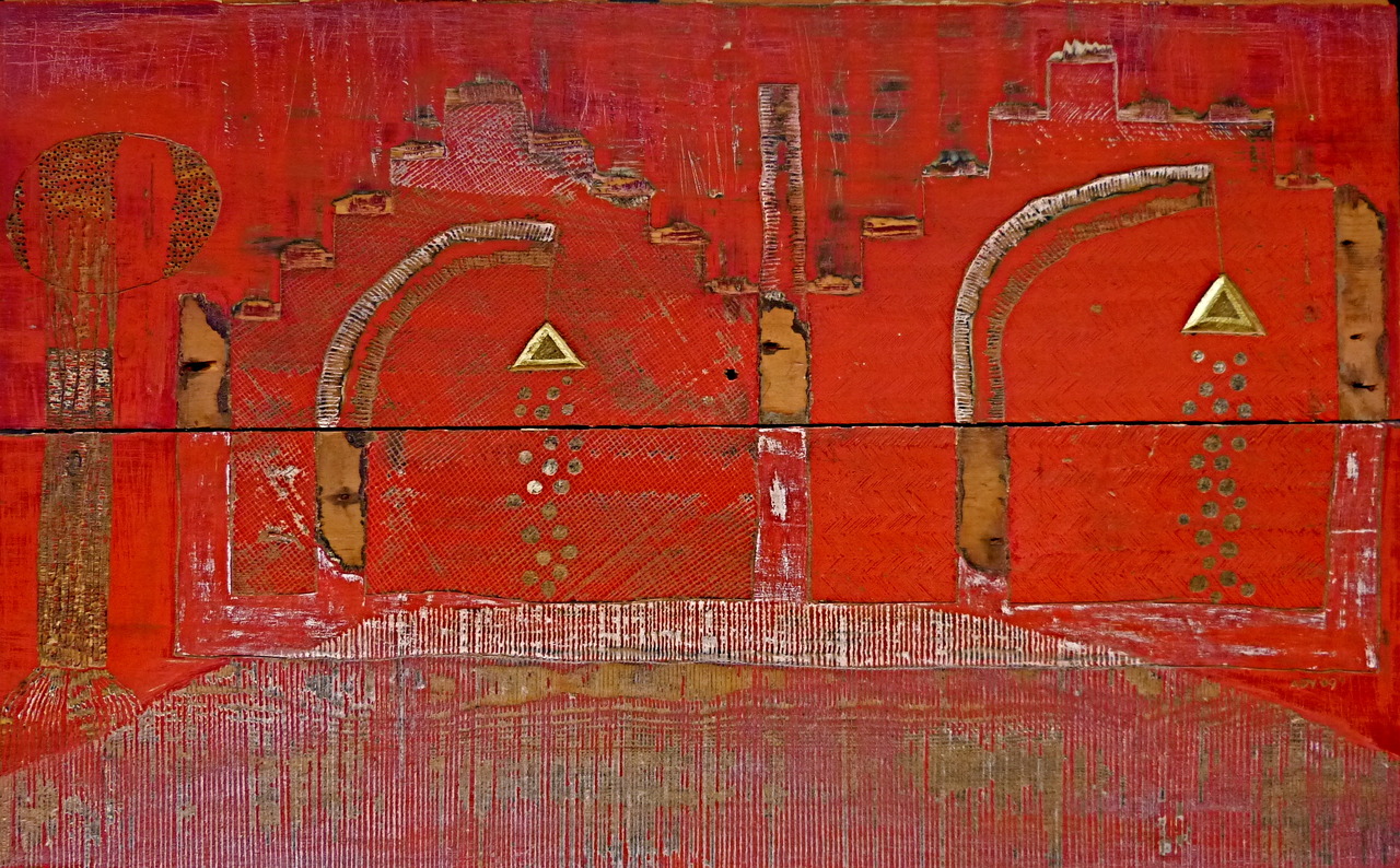 Twee samengevoegde kastplanken. Onder rode kleur: zwart. Gebruike materialen: verfkrabber, stanleymes, els, penseel, kwast.