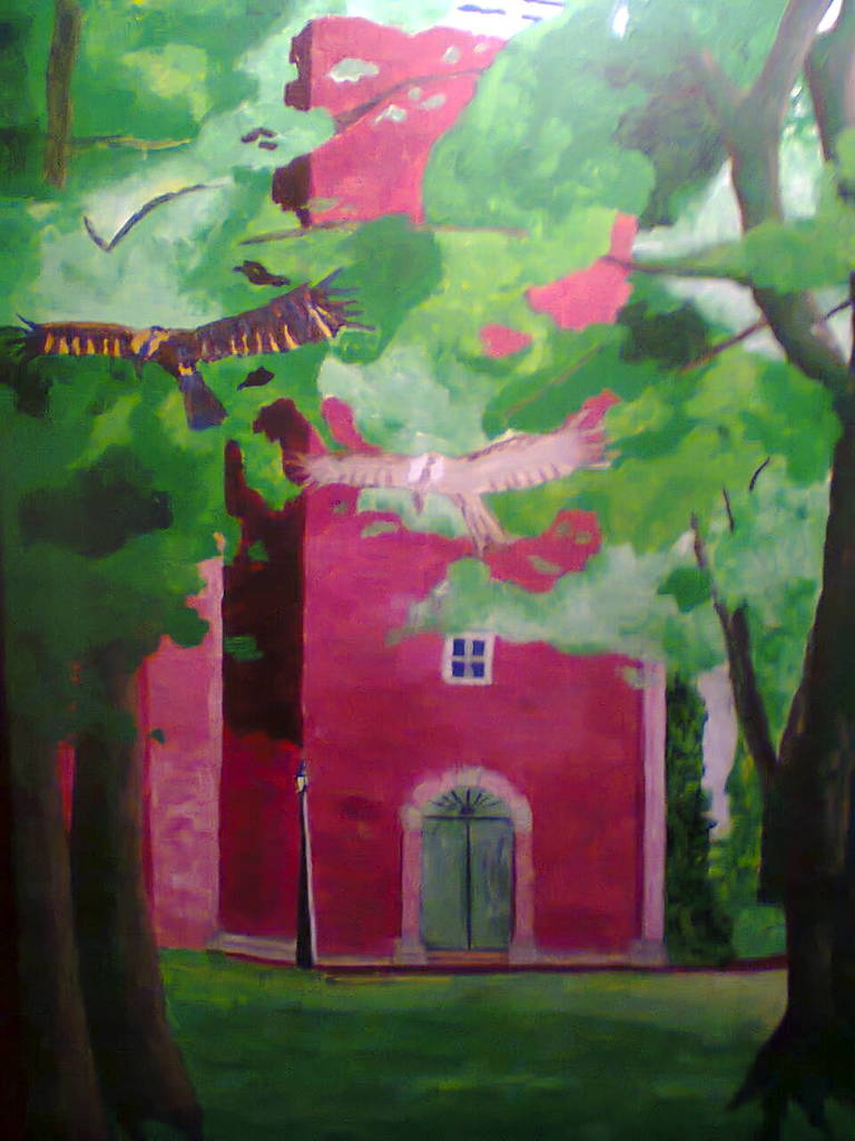 Op de achtergrond tussen twee bomen is voor een gedeelte een kerk zichtbaar waarvoor een vogel vliegt met achter zich de ziel van de bewustzijnswording met het doel in het lichaam te treden wat symbool staat voor het ontwaken van de geest.