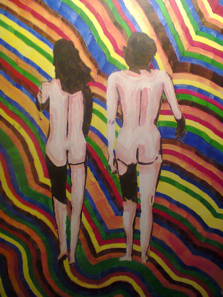 Twee vrouwen lopen samen naakt door een surreele wereld.