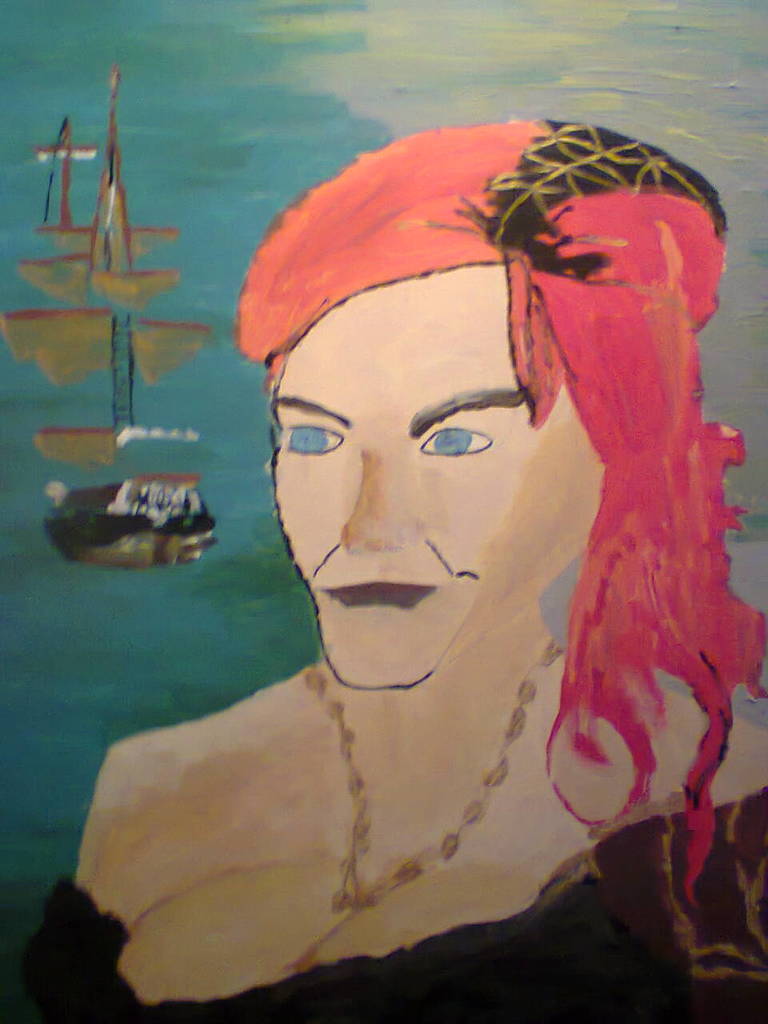 Op de voorgrond een rijke vrouw met achter haar het schip van haar man die uitvaart.