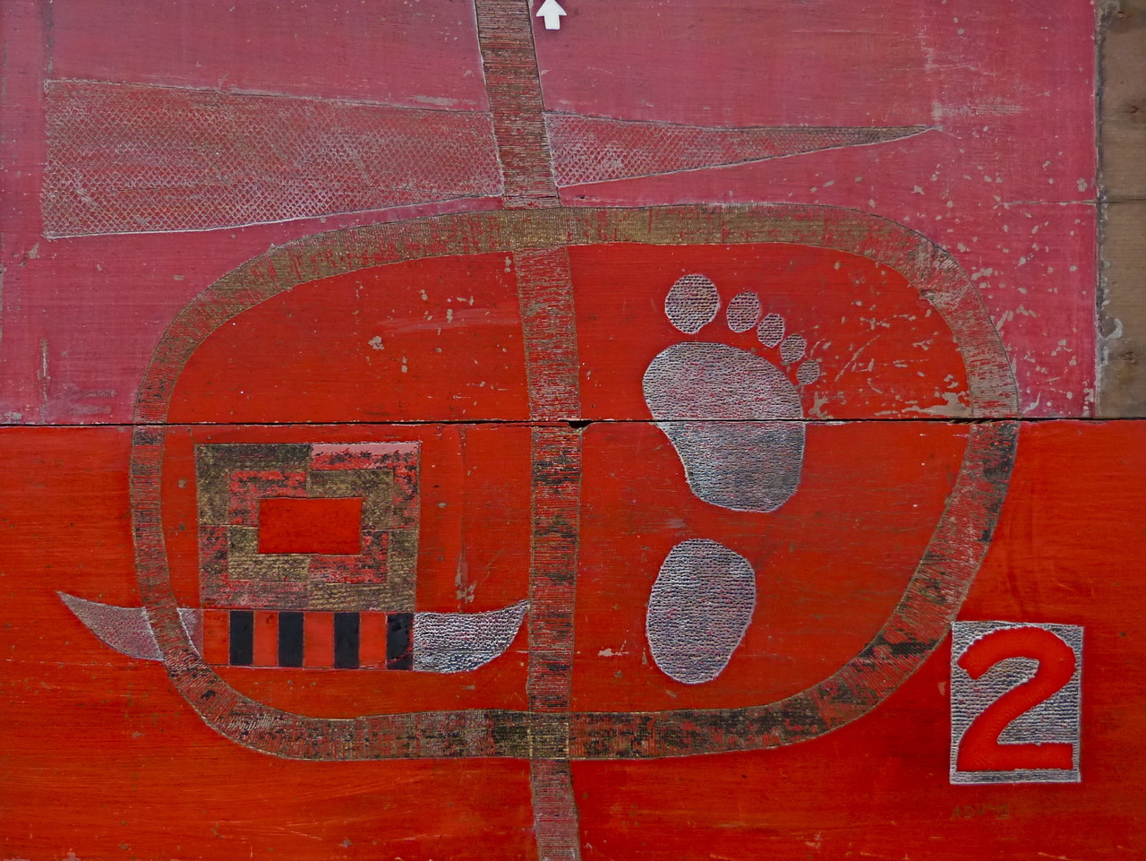 Twee samengevoegde planken. Beelden geprikt en gekrast met els en stanleymes. Extra kleuren: wit, zwart en lichtrood.