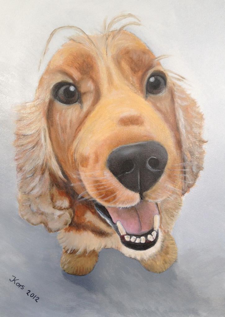 Bowie, de cockerspaniel. In opdracht geschilderd. Bowie is enige tijd geleden overleden en van een paar foto's heb ik hem vastgelegd met zijn vragende oogjes! Het baasje is helemaal tevreden!