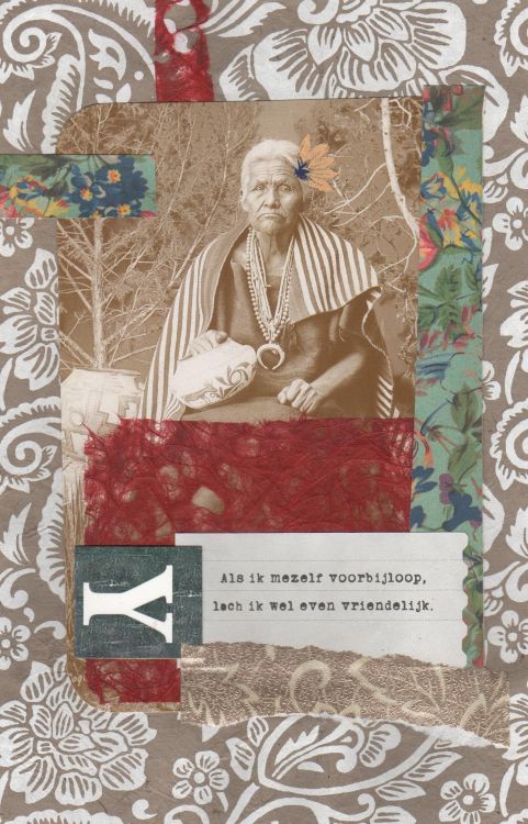 Collage met ansichtkaart uit Amerika, tekst uit Flow Magazine, henneppapier en Nepalees papier.