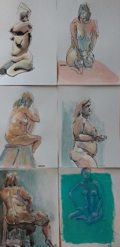 Zes schetsen naakte vrouw, getekend en geschilderd in inkt en acrylverf op stevig papier. Per stuk te koop voor € 39. Afmeting 24 x 32 cm. per stuk.