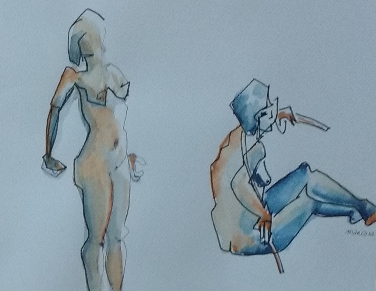 Tweemaal naakte vrouw in inkt en acrylverf op papier ca, 24 x 32 cm.