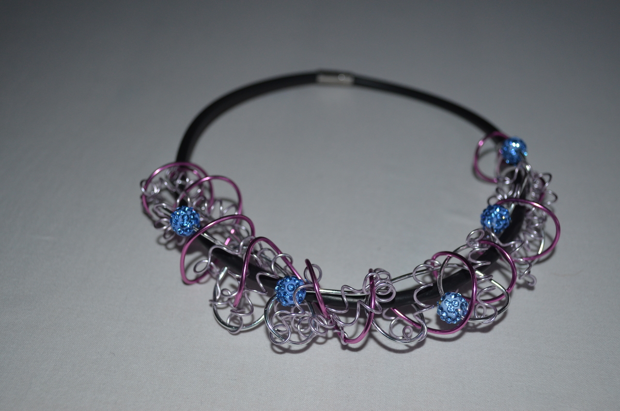 De verschillende diktes van zilverklerige en lila aluminium draad zijn over de buna koord gevlochten. Aan de zilverkleurige draad zijn sky blue swarovski kralen bevestigd waardoor een speciaal effect ontstaat.