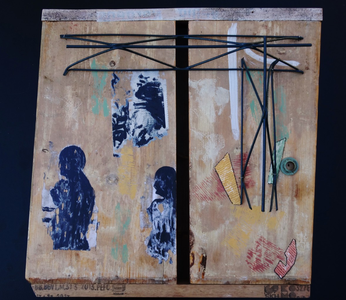 "Samen genomen / zijn deze twee helften / verder van elkaar verwijderd / dan indien apart gehouden." Assemblage (voor aan de muur), hout, metaal, papier, verf. Gemaakt van 'afval'