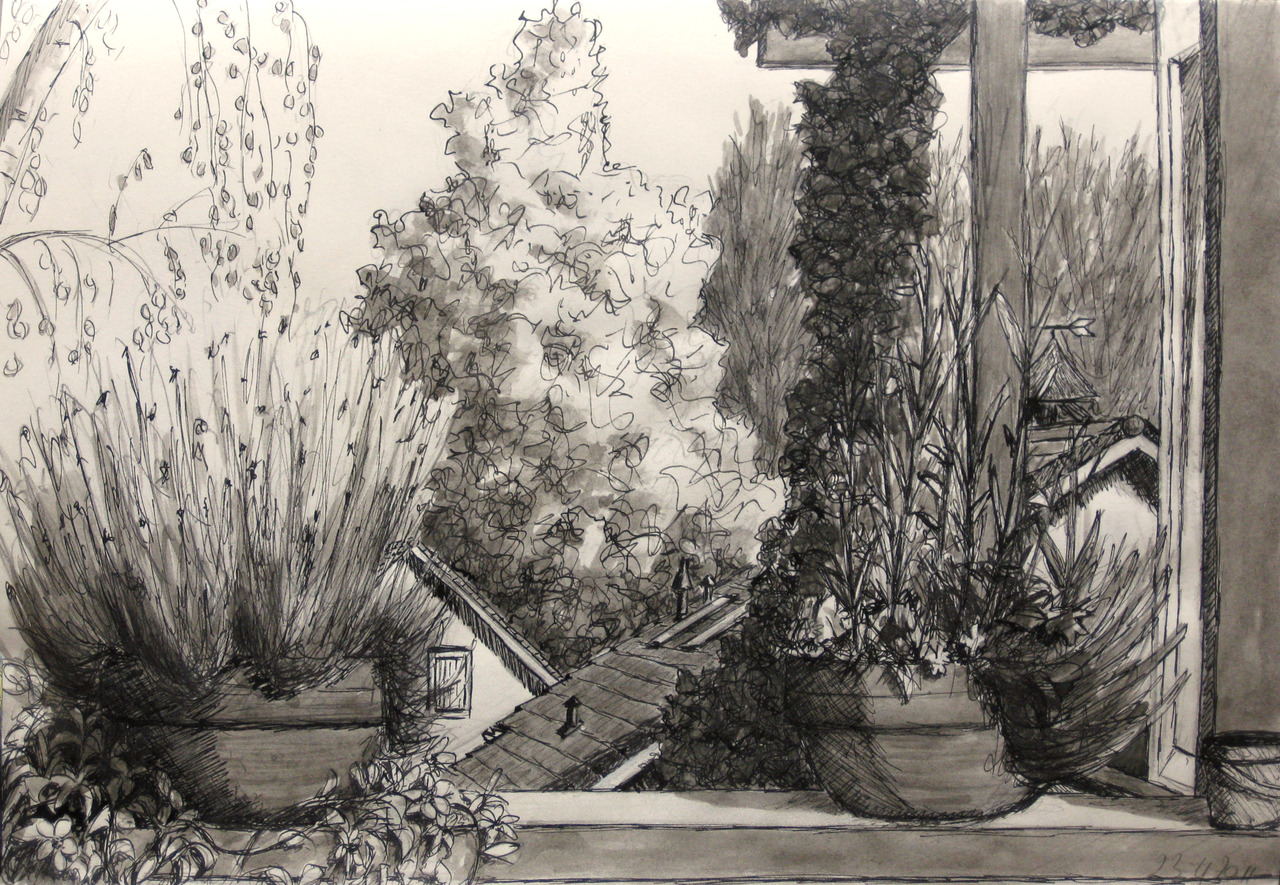 Uitzicht vanaf dakterras (plein-air tekening)