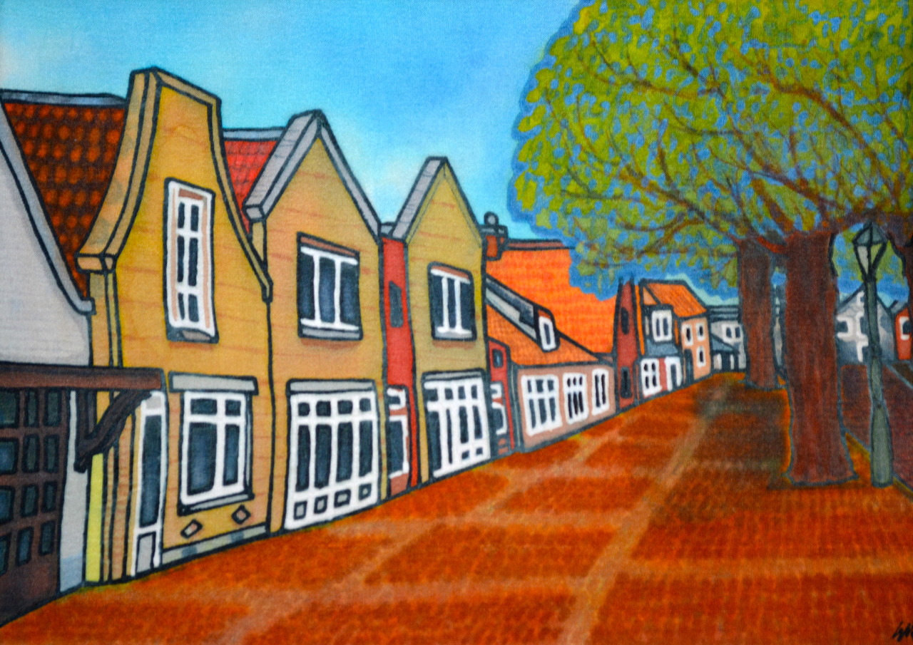 Inkt op Zijde schilderij, Noordstraat in Burg Haamstede. Met witte passe-partout. Prijs op aanvraag.