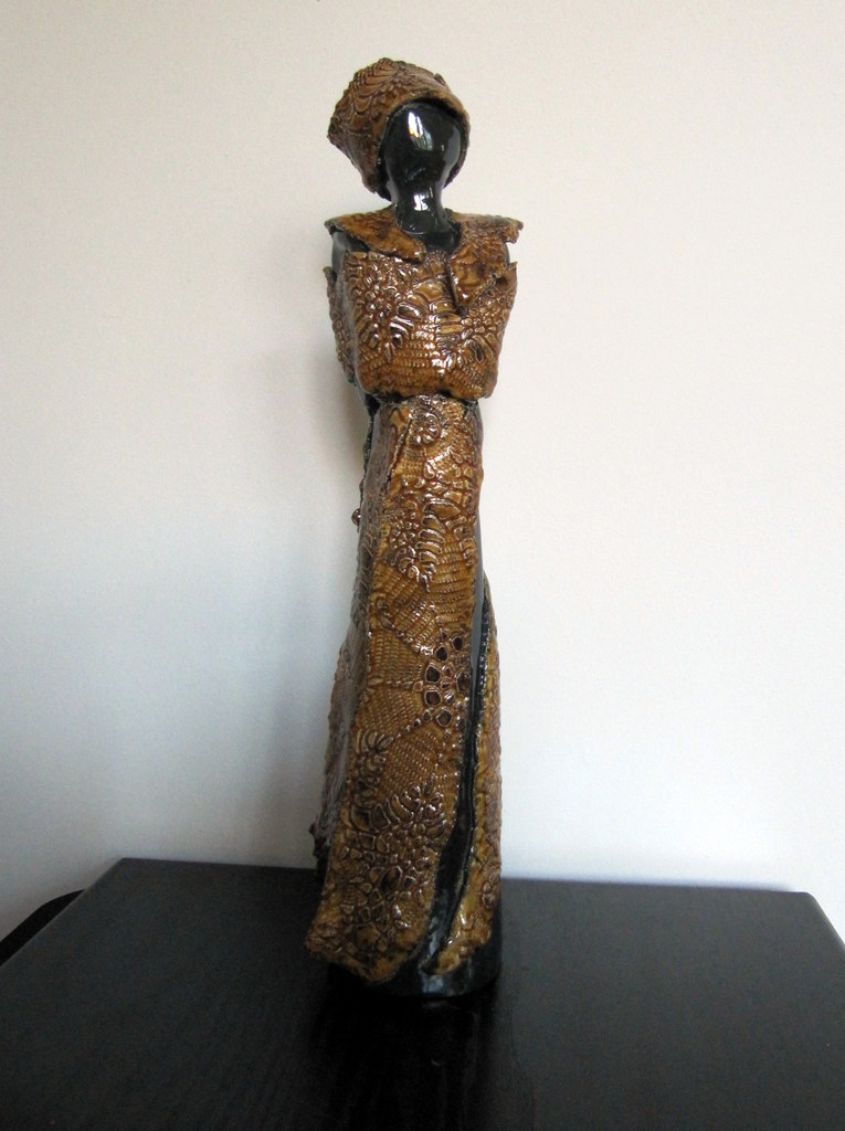 Staande vrouw, donker antraciet grijs, hoogglans. Kleding in honingkleur met kant bewerkt. Door de transparante glazuur is het kant motief zeer duidelijk zichtbaar.