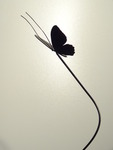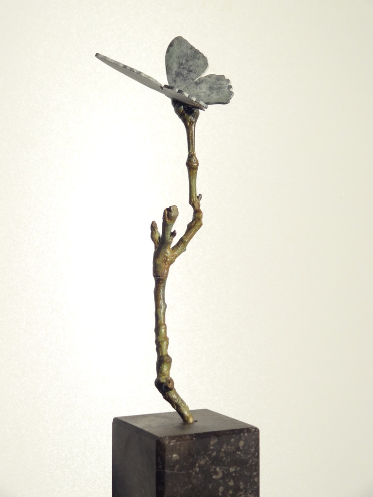 De vlinder is vervaardigd uit bronsplaat. De tak is gegoten volgens de bekende cire perdue methode. Staat op een belgisch hardstenen sokkeltje maar er kan op aanvraag uiteraard een ander soort en maat steen onder.