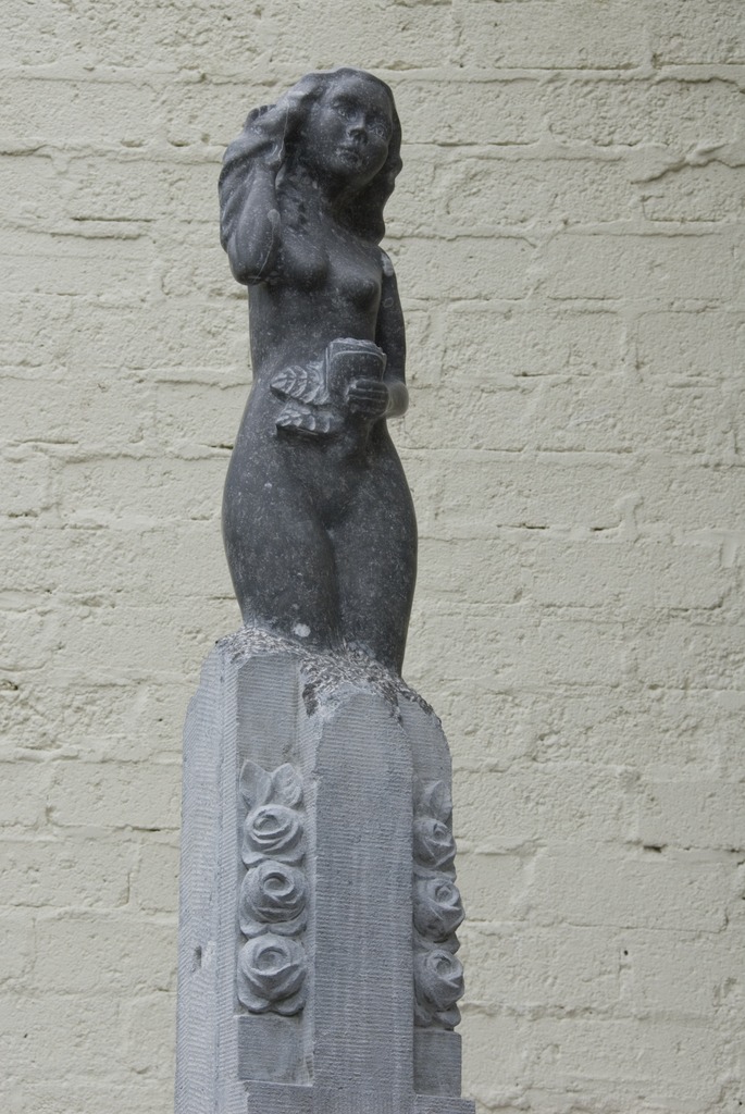 Bloemenmeisje van oud kruis grafmonument, Belgisch hardsteen, de roosjes aan de onderzijde langs het kruis zijn oorspronkelijk