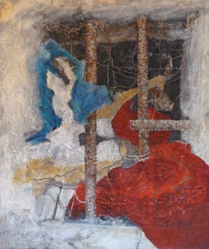 Iets in de buitenwereld intrigeert mij en door deze impressie uit te werken wordt zij blijvend deel van mijn binnenwereld. Laag na laag bouw ik aan de uiteindelijke vorm. Tijdens het werken komt er een stroom van associaties op gang. Het is een constant zoeken naar evenwicht tussen de verf en de andere materialen.