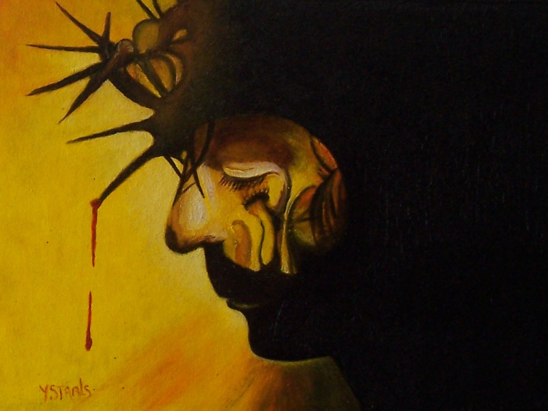 Jezus met doornenkroon. In het gezicht als symbool geschilderd Maria en Josef.