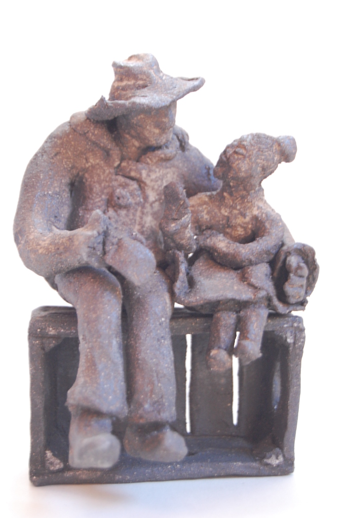 Opa en kleindochter praten al zittend op een veilingkist, in zwarte steengoedklei. Ook op aanvraag in variant te maken.