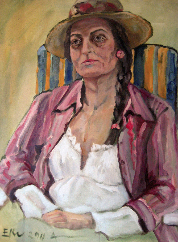 Zittende vrouw met hoed in roze blouse