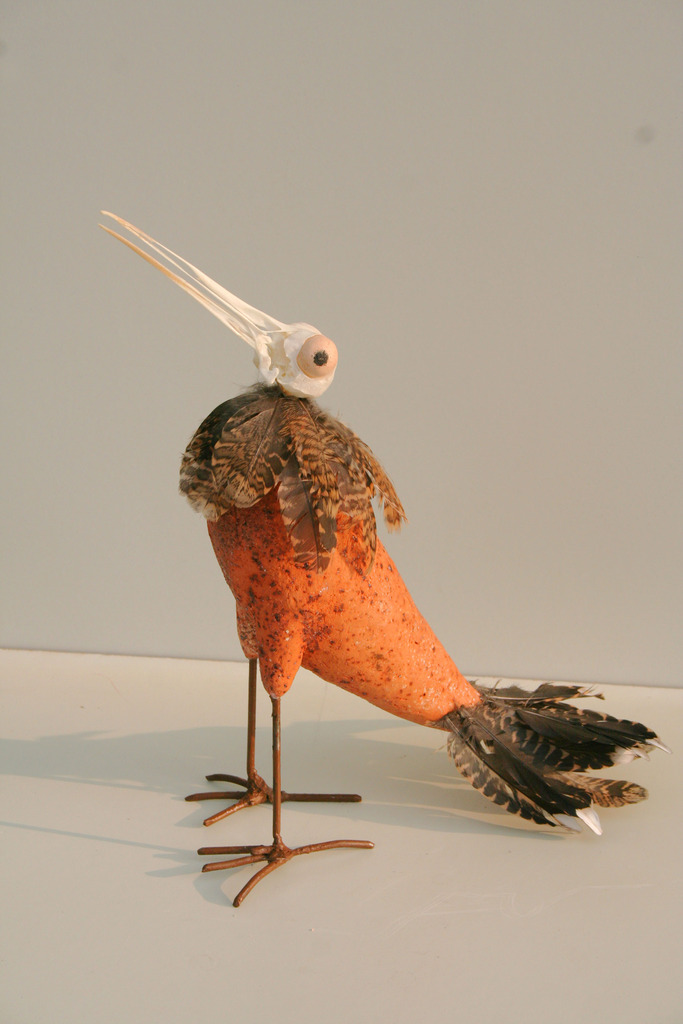 Schedel en pluimen van watersnip geïntegreerd in roodbakkende klei (1050°C)