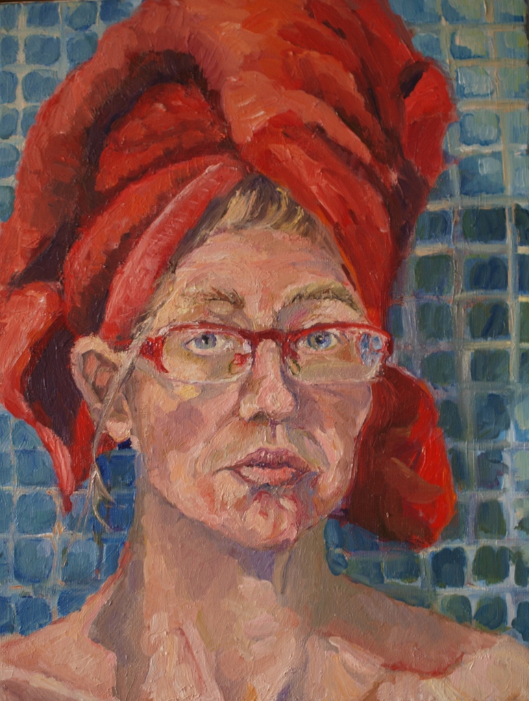 Rood Blauw Blue Bril Red Badkamer Zelfportret Handdoek Turqoise Selfportrait Bathroom Towel Glassel