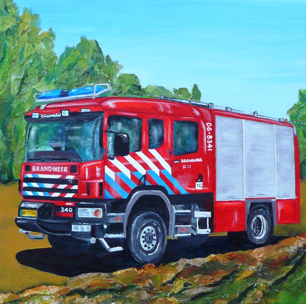 Acrylverf in combinatie met collage. Op 4 cm dik doek. Print beschikbaar op http://fineartamerica.com/featured/dutch-fire-truck-lida-bruinen.html