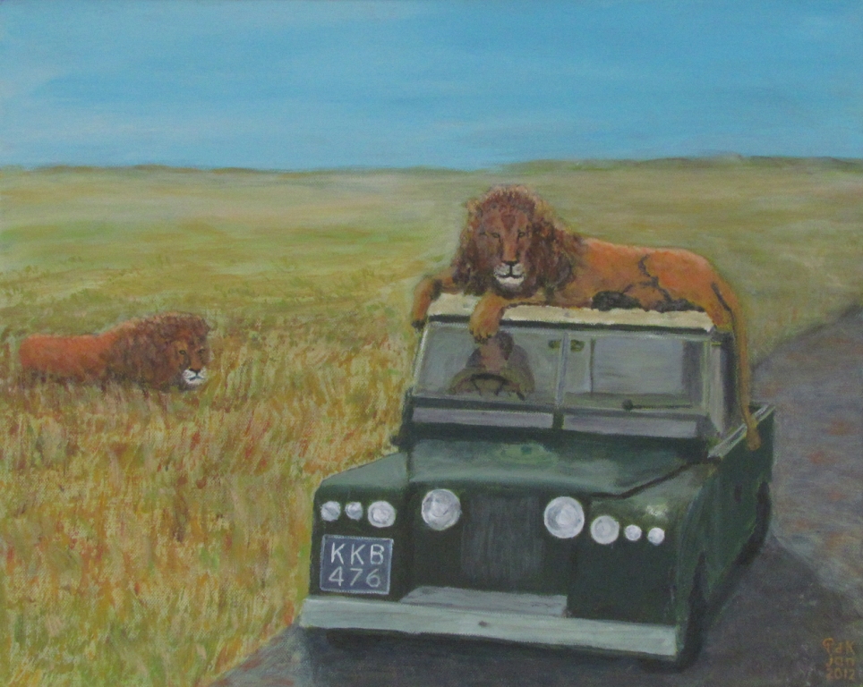 2 leeuwen in een savannegebied. De man in de Landrover hoopt dat hij het overleeft.