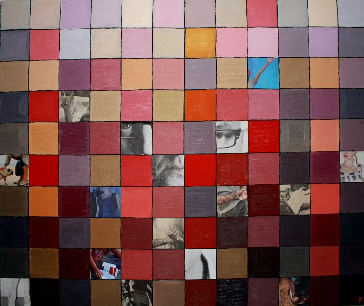 Abstracte en figuratieve olieverfschilderijen, met geometrische vormen, dieren en mensen als terugkerende elementen.