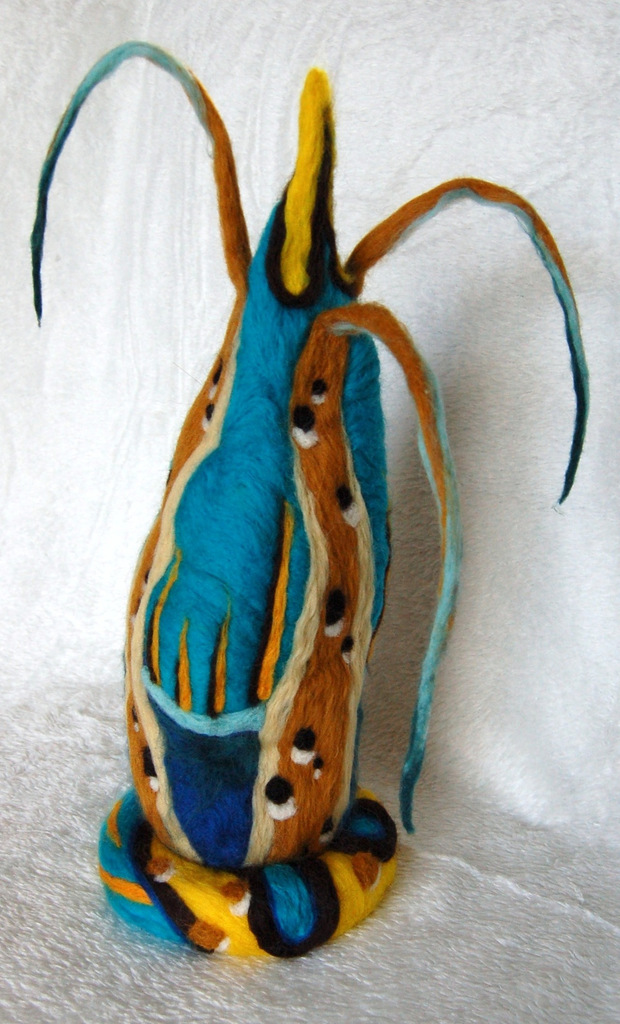 Veelgekleurde viltsculptuur naar eigen fantasie. Gemaakt met kleurrijke merino wol.