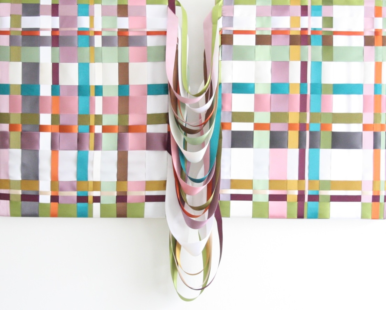 Gevlochten satijnlint dat gespannen is op een houten frame van 40 x 50 cm. Twee frames zijn aan elkaar verbonden door het lint, de tussenruimte is zelf te bepalen.