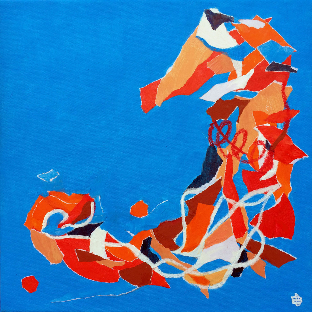 Acryl Collage Zeepaardje Seahorse Blue Orange Oranje Blauw Dier Abstract