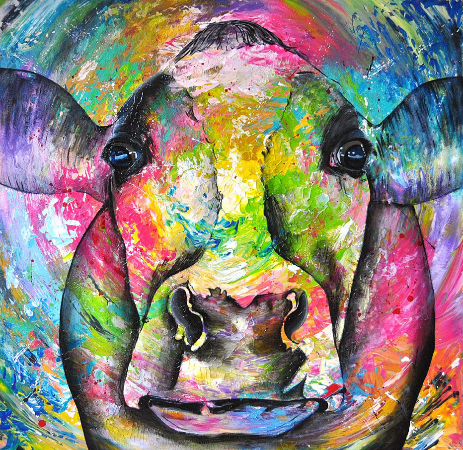 Schilderij Wit Modern Rood Geel Blauw Paars Groen Kleurrijk Koe Doek Moderne Schilderijen Vrolijk Koeien Cow Expositie Atelier Expositieruimte Anita Figratief Ammerlaan Lightscape